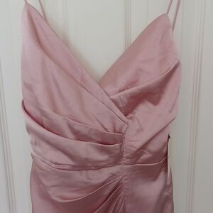 NWT Superdown Kimora mini dress in blush pink satin. Revolve style (BTWR-WD256), sold-out size. Surplice front with seam slit, pleated fabric, hidden back zipper, fully lined.