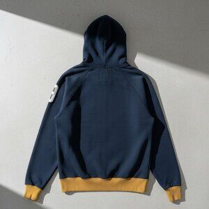This premium Samuel Zelig hoodie in Vintage Navy Yellow is crafted from 15 oz loopback heavyweight cotton sourced from Japan, offering exceptional structure, comfort, and durability. Features include raglan sleeves, contrast yellow ribbed cuffs and hem, multicolor embroidery, and signature patch pockets. Made in Los Angeles with meticulous construction details: double-needle coverstitch seams and chainstitch hood finishing.