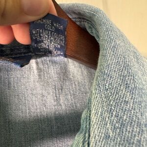 Vintage Winnie the Pooh Chambray Denim button up style vest features a collar front pockets with embroidered Pooh logo and Pooh bear peeking out, full front button closure. Please note this has been altered to be a raw cut hem at the bottom for a more boxy fit. Please refer to measurements.