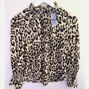 LOFT Animal Print Ruffle Mock Neck Blouse Smocked Cuffs Petite Size XSP NWT $69