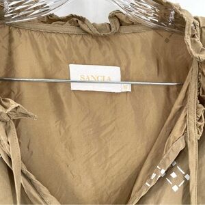 In great condition! Womens size small The '70s-inspired peasant top remains a favorite for its blouson sleeves, which lend a soft, breezy quality and laidback air to any outfit. Balance its loose fit by tucking it into denim shorts or a high-waisted pair of pants. About Sancia Famed for their etched leather handbags, the Australian brand Sancia expanded in 2017 to the world of apparel. Lending a boho-minimalist aesthetic to everything from peasant tops to skirts and jumpsuits, the brand taps into the very sentiment of stylish summer adventuring, through a palette of warm hues and classic, nautically inspired stripes. Cupro, viscose Balloon sleeves Ruffled cuffs and hem Spliced neck Pullover styling Imported