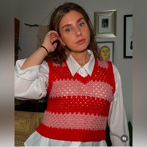 This such a cute top! Hand crocheted with crocheted buttons up the front. Notched at the top.