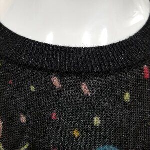 Black galaxy space planets universe metallic knit top. Ribbed knit cuffs, hem, & neck. Scene kid, indie sleeze, indie sleaze, whimsigoth. Brand: Zara Knit Size: Small Made in: China Materials: 77% viscose, 15% polyester, 8% metallic fiber Condition: Good. A few pulled threads sprinkled around. Spot on back right sleeve? Attracts lint! Flat measurements in inches: Width (A): 16 Length (B): 19 1/2 Colors may be different in person than on the screen. Measurements are approximate.