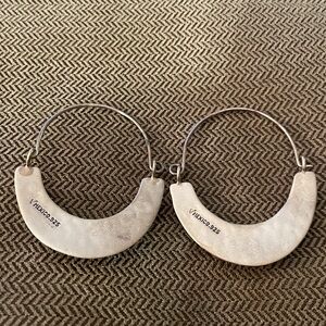 These handmade hoop earrings are made of 925 Mexican sterling silver. They feature a flat arc with a green, blue, and orange enamel button on each earring. The wire piece that inserts into the ear fastens inside a small loop. There is some general oxidized tarnishing throughout but can be polished. The back of each flat arc is engraved with “Mexico 925” and a checkmark. Great condition. Measurements are 1 11/16” tall and 1 3/8” across.