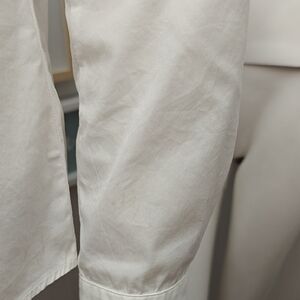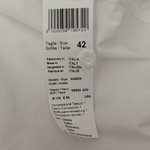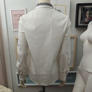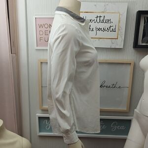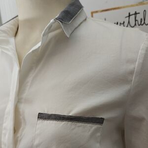 Sophisticated white shirt with subtle gray detail. Perfect for a refined style. Very faint marks on left sleeve, see pictures. Pit to pit 18" and length 23". Size 42 (s/m).