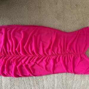 Step out in style with this Guess dress, featuring a vibrant pink hue and a flattering ruched design. The sleeveless bodycon silhouette is enhanced by spaghetti straps and a v-neckline, making it perfect for a night out or cocktail event. Its midi length adds a touch of elegance, ensuring you make a statement wherever you go. Only worn once.