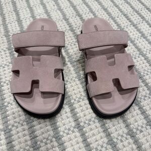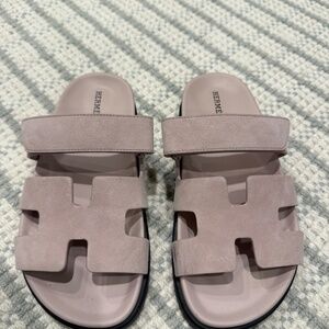 Hermes Chypre Light pink suede sandals. Only worn once. Slight scuffing on inner left sandal near toe.