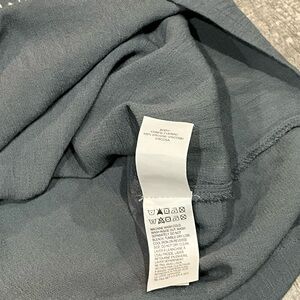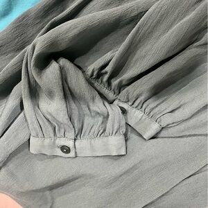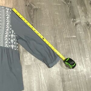 Worn in great condition no holes or stains. Chic charcoal blouse with delicate white embroidery. Features a tie neckline and three-quarter sleeves.