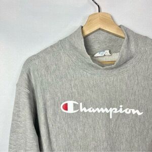 Champion Light Gray Mock Neck Script Reverse Weave Logo Sweatshirt Excellent used condition, no visible signs of wear. - Light grey color - Long sleeves - Mock neck - Logo script detail - Side panel detail - Ribbed hem detail - Reverse weave style - 55% cotton 45% polyester Measurements: - Bust 20 - Length 27 All items come from a smoke & pet free environment and ship same or next business day.