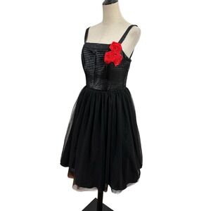 Unique Vintage black cocktail dress featuring a pleated satin bodice and full tulle skirt for a classic, feminine silhouette. Adjustable shoulder straps and a fitted waist with a softly flared skirt. Finished with a bold red rose applique at the bust for a vintage-inspired pinup look. Back zipper closure.