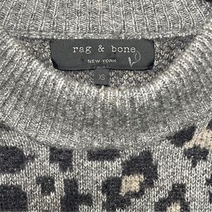 Embrace a chic, modern aesthetic with this Rag & Bone leopard print sweater. The soft grey marled knit features an abstract leopard pattern that graduates down the body, creating a dynamic visual appeal. Crafted for both warmth and style, this sweater offers a comfortable and flattering fit perfect for layering or wearing on its own. Elevate your everyday look for a casual brunch or a sophisticated evening out.
