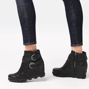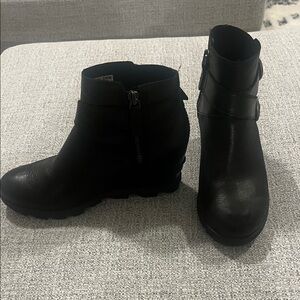 Stylish black ankle boots. Features buckle detail and side zipper. Durable and comfortable design.