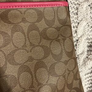Elegant Coach crossbody with signature pattern. Features vibrant pink accents. Ideal for versatile styling.