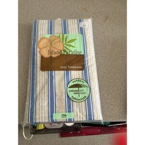 This 70 inch round tablecloth features a blue and tan striped pattern, perfect for adding a touch of style to any umbrella patio table. Made of vinyl, it is durable and easy to clean. The umbrella hole adds functionality, allowing for easy access to your umbrella while dining. The classic blue color adds a pop of personality to your dining experience.