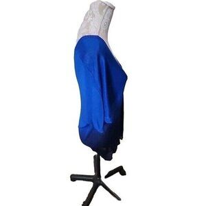 Elevate your wardrobe with this stunning Chico's women's pullover sweater. The v-neckline and dolman sleeves create a chic and modern look, and the blue ombre pattern adds a touch of unique style. This sweater is made of 100% Rayon and is a thin knit style, making it perfect for layering. The slinky knit material drapes beautifully and is comfortable to wear all day long. The sweater is sized as a Large and has a regular fit.