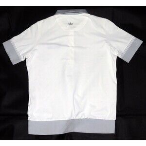 The Peter Millar Women's Performance Short Sleeve Golf Polo Shirt in size Medium is a stylish and comfortable activewear top designed for women. Made from a blend of 94% polyester and 6% spandex, this polo shirt features a solid white and gray color, a collared neckline, and a button closure for a classic look. The regular fit and pullover style make it easy to wear for any casual occasion, while the machine washable material ensures easy care and maintenance. With its high-quality construction and reputable brand name, this polo shirt is a versatile and fashionable addition to any woman's wardrobe. Peter Millar Women's Performance Short Sleeve Golf Polo Shirt Size Medium. See pictures for condition. The measurements are approximately: Armpit to armpit (Chest) 19 1/4" inches across Length 24" inches from the collar seam to the bottom of the shirt