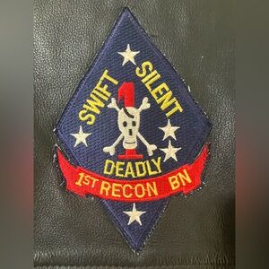 This vest also features a United States Marine Corps (USMC) 1st Marine Division "Guadalcanal" patch, an officially licensed United States Marine Corps (USMC) 1st Recon Battalion patch, it is considered a collectible item, a patch that commemorates the Battle of Belleau Wood, a significant World War I battle that helped shape the Marine Corps' reputation, a Leominster Police (Massachusetts) shoulder patch, sold as a collectible item, an American flag patch, a U.S.M.C. 3rd Battalion 5th Marines lapel pin, a Harley Owners Group (HOG) ABCs of Touring 2000 collectible pin as well as a Harley Owner Club patch and a winged Bar & Shield logo patch on the back.