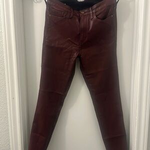 No size tag but is 28 The Stiletto Coated High Rise Skinny Ankle Jean is the perfect pairing of a bold color and the soft gloss of coated denim. A high waist and an ankle-length hem make these jeans as flattering as they are fiery.