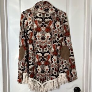 Entro women’s vintage inspired longe sleeve poncho top with fringe. Size large. Features elbow pads, cowls neck, and fringed bottom hem. Stretchy terry cloth like fabric.