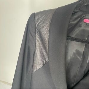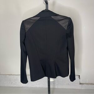 Chic black blazer with leather details. Single-button closure. Perfect for versatile styling.