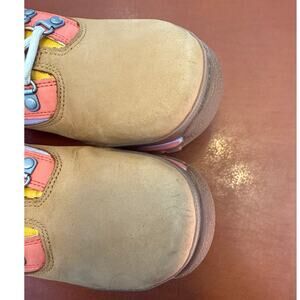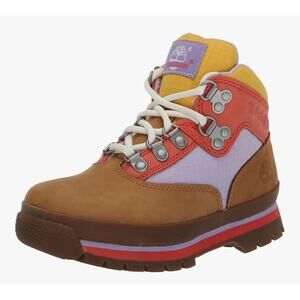 Timberland Boys Kids Euro Hiker Boots Boys Size 6 UK Size 5.5 EU Size 39 Made in Vietnam Imported Rubber sole Ankle height with shaft circumference of approximately 7.25 inches Upper made with premium Timberland leather and ReBOTL fabric containing at least 50 percent recycled plastic ReBOTL fabric lining and 100 percent recycled PET laces Lace up style with metal D ring eyelets Leather Working Group responsible leather Non marking rubber lug outsole for traction on various terrains EVA blend foam midsole for high rebound cushioning Padded mesh collar for comfort Colorway includes tan leather, light purple and white patterned textile sides, orange or coral accents, and yellow heel details Condition is excellent gently used Notable signs of wear include slight creasing and a couple of very small toe scuffs Some additional deep cleaning may improve further Seller note: I wear a womens size 8 and these fit me comfortably with wiggle room Perfect for hiking, outdoor play, school, travel, and everyday wear