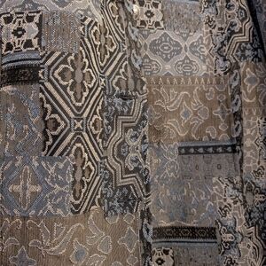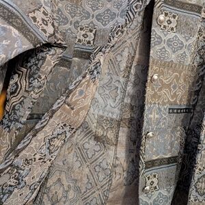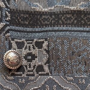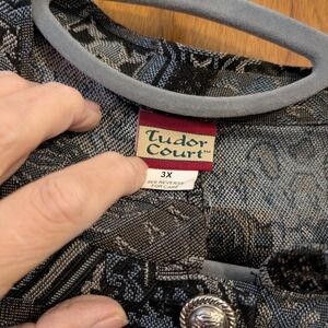 Elegant Tudor Court jacket with intricate black and gray patterns. Features a stylish button closure. No stretch brocade. 29" long; 52" bust. Front hidden slit pockets.
