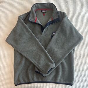 Soft gray fleece with navy accents. Red trim adds a pop of color. Ideal for layering. Regular fit, hip length, chest pocket & snap-t styling! Made with Synchilla polyester fleece that’s velvety smooth, wicks moisture & dries quickly.