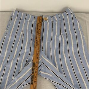 Stylish blue wide-leg pants with black and white stripes. Features a button closure.