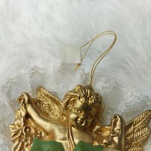 Elegant gold angel cherub Christmas tree ornament featuring lace, green leaves with a burgundy rose, beads, and gold ribbon bow. Perfect for holiday decor.