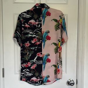 Embrace a tropical vibe with this stylish button-down shirt. Featuring a vibrant mix of pink and black, macaw parrots and flamingos, this shirt is perfect for casual outings. Vintage brand Smoke Rise NY gives alternative vacation goth. Enjoy the comfort and unique design that stands out.