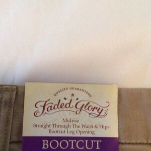 Faded Glory Women's Boot Cut Jeans. Stylish boot cut jeans in khaki. Size 14A, 31 inch leg inseam, mid rise, super stretch, authentic denim with tummy control panel. Comfortable and versatile. Ideal for everyday wear.