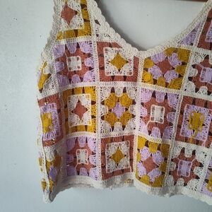 Embrace a bohemian vibe with this colorful crochet women top. Featuring a blend of pink, orange, and cream hues, this top is perfect for a casual day out. Pair it with your favorite jeans for a chic look.