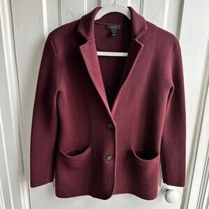 J. Crew Merino Wool Sweater Blazer Burgundy Size XS Details: Burgundy Sweater blazer Long sleeves Front two button closure Notch collar Front slip pockets 100% merino wool Approx. measurements: Armpit to armpit = 19.5" Shoulder to hem = 26.5" Excellent preowned condition