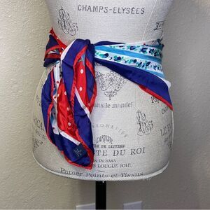 Vibrant scarf with polka dots and floral patterns. Features red, blue, and white colors. Perfect for adding a pop of color to any outfit.