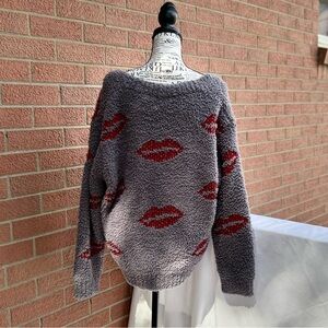 POL Off-the-Shoulder Gray Sweater with Red Lips