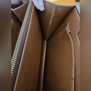 In good condition, it has normal signs of wear and tear. Glazing has deep cracks, creasing and splits around the bag and on the handle part. I painted the edges with dark brown coating. Canvas are in good condition. Inside: There is dirt, rubs, discoloration, and some dark spots. I cleaned the pockets so they can be used again. I didn't clean one of the inside pockets, so you could see some cracking on the brown material, but it is not coming off. Please see the pictures for details. Handle is a little bented/creasing, but it does not affect the bag. Gold hardware has wear and tear, discoloration scratches & the zippers work well, but a little rough to zip it. Gold clasp has normal wear and works properly. This is a vintage bag, so it has slight storage smells.
