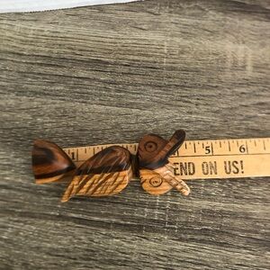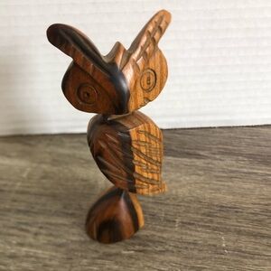 Cute striped wooden owl. Hand carved, I believe this is the type of owl with the fluffy ears (sorry I’m not up on my owl species). Very smooth. Not too heavy but still sturdy. Very well done art piece.