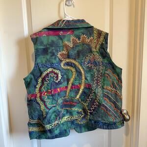 Chico's sleeveless vest featuring intricate multicolor embroidery on a green cotton fabric.
