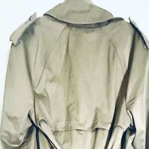 Elegant trench coat with a timeless silhouette. Features a waist belt and button closure with plaid wool zipper liner able to be removed for chilly Fall days or add for cold Winter months. Perfect for any occasion. Wide collar that when pulled up doubles as a half hood covering back of neck to crown but it is not a full hood made to keep cold from creeping down back and add warmth and protection from elements without weighing down hair .