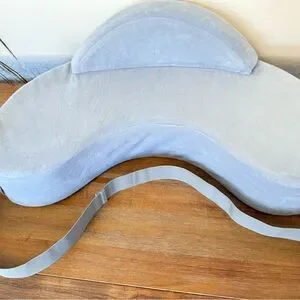 Light blue nursing pillow by Momcozy. Soft and comfortable design. Has an anti fall bumper and straps on for peace of mind and safety. Washed as a courtesy but didn’t really need it. Barely used.