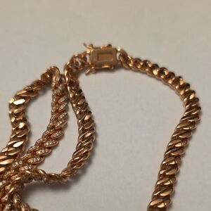 Stunning Unisex Rose Gold over SOLID 925 Sterling Silver 18" Iced out Icy Cuban Curb necklace, chain choker. Features slide insert clasp with figure eight closure for security. Handset simulated white pave diamonds which adds a touch of elegance to any outfit. Perfect for special occasions or everyday wear. This is a quality heavy duty handmade piece that weighs 45grams of Solid Sterling Silver.