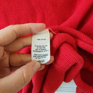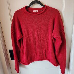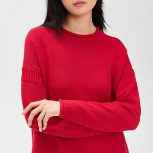 Bold red sweater with a classic crew neck. Soft and cozy, just doesn’t fit me the way I’d like it to!