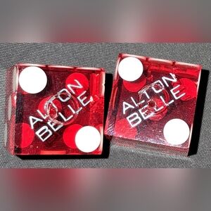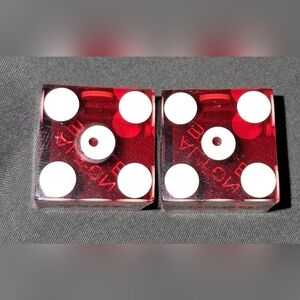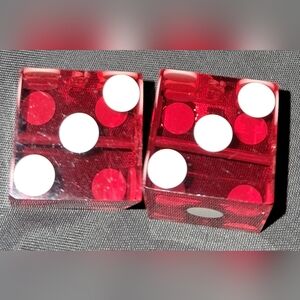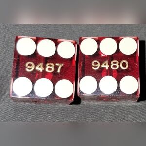 Casino dice. Acquired in 1999. Translucent red dice with white dots. Casino name on one side. Small indented red dot on one side. ## 9487 & 9480 on one side. About 3/4" cube. Buy Now. Bundle and SAVE! See closet for FREE with PURCHASE items.