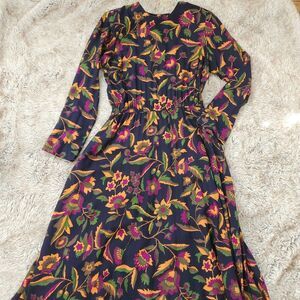 Dépèche Mode Vintage Long Sleeve Floral Shirt Dress Size 8 Excellent vintage condition. No flaws Long sleeve, all over floral shirt dress with button down closure down the back and elastic waistband Pit to pit 18" Waist 14" Length 50 1/2" Sleeve 23 1/2" keywords: vintage, retro, boho, bohemian, funky, colorful, unique, modest, career, office, business casual, party, summer, spring, fall, cute