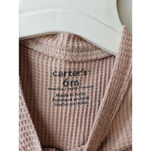 Adorable Carter's baby girl 2-piece outfit in size 6 months. Includes a waffle-knit long sleeve Henley bodysuit and matching pants in a dusty blush pink with tiny floral print. Soft cotton-blend fabric with great stretch and comfort. Bodysuit features 3-button Henley front and secure snap closure. Pants have an elastic waistband with a decorative drawstring. Set is in excellent pre-owned condition with no stains, holes, or flaws. Clean and ready to wear