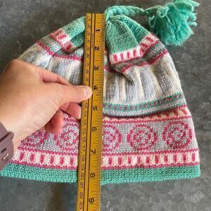 Vintage Fair Isle Wool USA Beanie Hat Cap Mint Green Pink Pom Pom Kidcore Candy