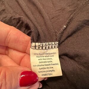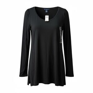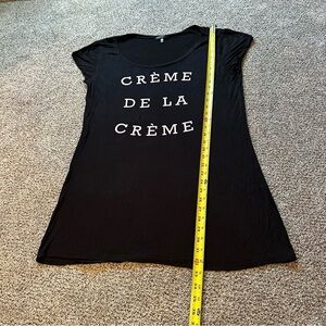 This Tart is technically a size L Black Long Sleep Tee, with a stylish graphic of crème de la crème. Made from a blend of spandex and soft rayon jersey, this tunic/dress features a round neckline and short sleeves, perfect for a relaxing night's sleep. The graphic accents add a touch of designer flair so you can even wear as loungewear or running errands paired with leggings! Too cute to only hide when you go to sleep. Great tunic length makes it super versatile. Retail $40.