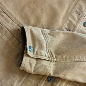 Make an offer on this great every day jacket in a beautiful caramel brown color with darker brown corduroy accents at collar and cuff. Cuffs can button or flip up to show the corduroy. Great to layer for 3 season comfort. Mid-weight so can be worn like a jean jacket indoors and outdoors. Button front and horizontal slash pockets up front. Please let me know what questions you have. Priced for quick sale!