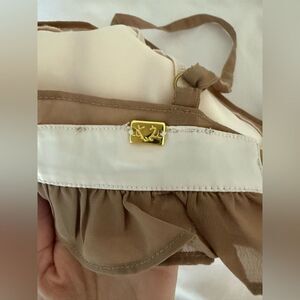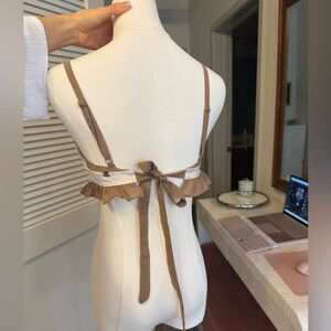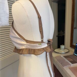 Features light cream satin w/ sheer light brown ruffle accents. Adjustable straps.