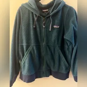 Warm fleece jacket by Patagonia. Features a zip-up front and drawstring hood.
